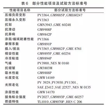 各類產(chǎn)品根據(jù)車型、產(chǎn)品功能和特點選擇相應(yīng)的項目和指標(biāo)。同一公司不同車型的同類產(chǎn)品具體的指標(biāo)可以不相同。雖然各公司標(biāo)準(zhǔn)的結(jié)構(gòu)、具體的試驗條件和指標(biāo)不相同,但同一性能項目的基本原理大體相同。部分性能項目及這些項目的部分試驗方法標(biāo)準(zhǔn)號見表 6。