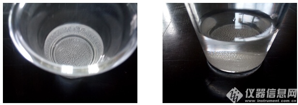 下圖為消解效果,其中左側(cè)較為渾濁的是硝酸-雙氧水體系,消解完成以后,溶液里有細(xì)小的白色沉淀物;右側(cè)澄清透明的是硝酸-氫氟酸體系,溶液中無(wú)不溶物,消解十分徹底。