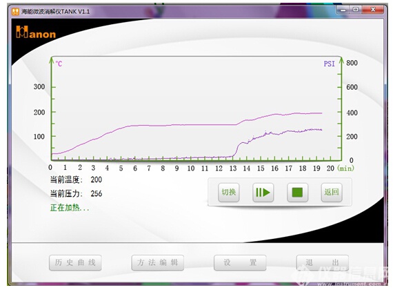由于TANK微波消解儀具備獨(dú)有的無(wú)限遠(yuǎn)程控制功能,所以我們可以很簡(jiǎn)單的通過(guò)電腦來(lái)遠(yuǎn)程控制微波消解儀消解實(shí)驗(yàn)。上圖的微波消解曲線1是電腦上的無(wú)線控制微波實(shí)驗(yàn)的操作界面,微波消解曲線2,是電腦上保存的歷次微波消解實(shí)驗(yàn)曲線,我們可以隨時(shí)查看以往的消解曲線,也可以隨時(shí)查看實(shí)驗(yàn)中每個(gè)時(shí)間點(diǎn)所對(duì)應(yīng)的壓力和溫度。