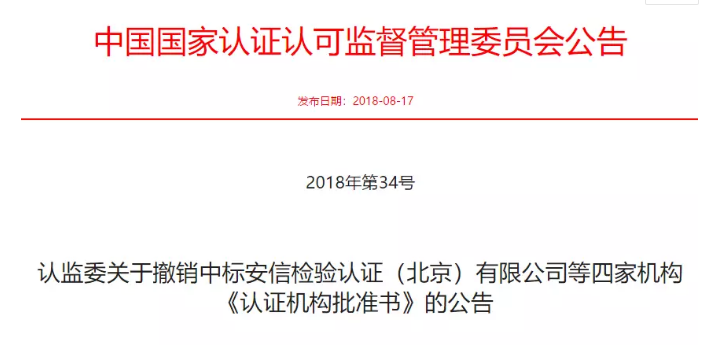 又有4家認(rèn)證機(jī)構(gòu)被撤銷(xiāo)批準(zhǔn)書(shū)!