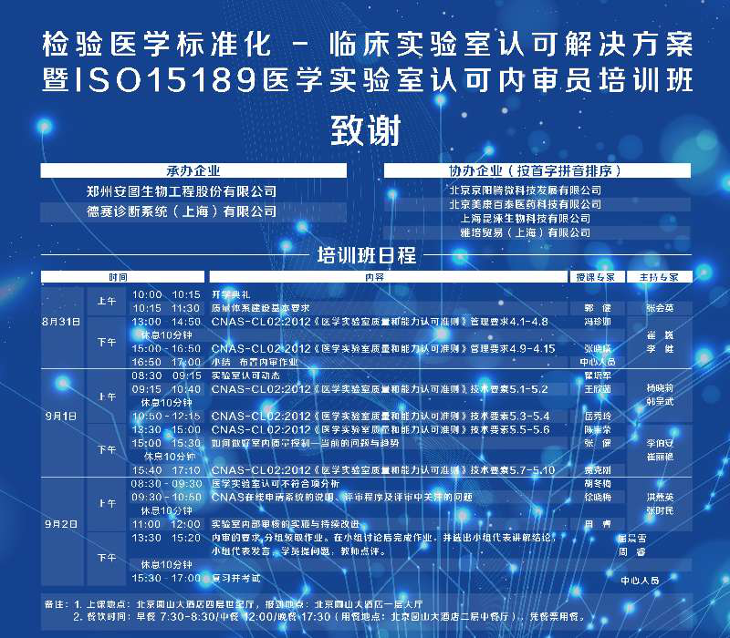 晴空萬(wàn)里、秋風(fēng)送爽,在這個(gè)收獲的季節(jié)里,北京臨床檢驗(yàn)中心、北京列伯實(shí)驗(yàn)室認(rèn)可技術(shù)交流中心、檢驗(yàn)醫(yī)學(xué)分會(huì)及北京精準(zhǔn)醫(yī)學(xué)學(xué)會(huì)共同舉辦了“檢驗(yàn)醫(yī)學(xué)標(biāo)準(zhǔn)化-臨床實(shí)驗(yàn)室認(rèn)可解決方案”暨ISO15189醫(yī)學(xué)實(shí)驗(yàn)室認(rèn)可內(nèi)審員培訓(xùn)班。