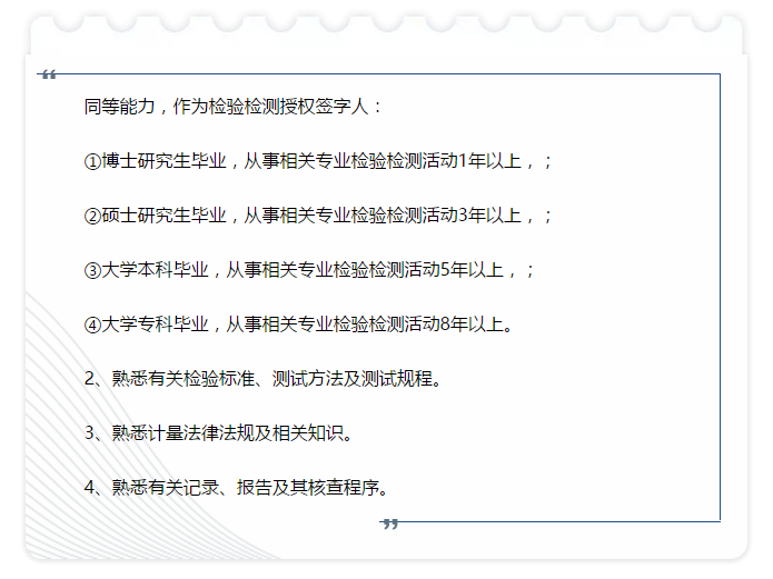 1、自2015年起,檢驗(yàn)檢測(cè)機(jī)構(gòu)授權(quán)人簽字人的資質(zhì)已從原來(lái)的中級(jí)以上(含中級(jí))技術(shù)職稱(chēng)改為了中級(jí)以上(含中級(jí))技術(shù)職稱(chēng)或同等能力。