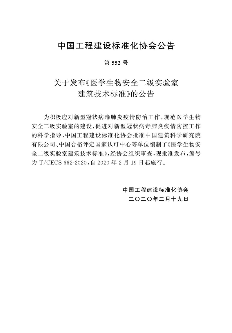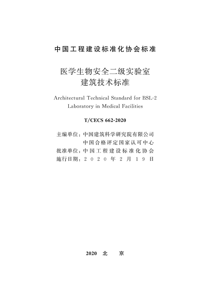 為積極應(yīng)對(duì)新型冠狀病毒肺炎疫情防治工作,規(guī)范醫(yī)學(xué)生物安全二級(jí)實(shí)驗(yàn)室的建設(shè),促進(jìn)對(duì)新型冠狀病毒肺炎疫情防控工作的科學(xué)指導(dǎo),中國工程建設(shè)標(biāo)準(zhǔn)化協(xié)會(huì)批準(zhǔn)中國建筑科學(xué)研究院有限公司、中國合格評(píng)定國家認(rèn)可中心等單位編制了《醫(yī)學(xué)生物安全二級(jí)實(shí)驗(yàn)室建筑技術(shù)標(biāo)準(zhǔn)》,經(jīng)協(xié)會(huì)組織審查,現(xiàn)批準(zhǔn)發(fā)布,編號(hào)為T/CECS662-2020,自2020年2月19日起施行。