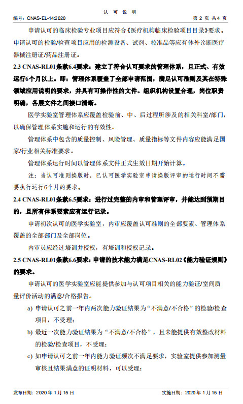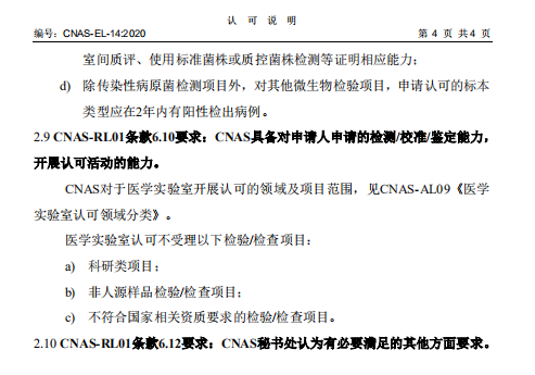 為明確醫(yī)學(xué)實驗室認(rèn)可受理條件,促進(jìn)醫(yī)學(xué)實驗室認(rèn)可制度順利實施,中國合格評定國家認(rèn)可委員會(CNAS)組織制定了CNAS-EL-14:2020《醫(yī)學(xué)實驗室認(rèn)可受理要求的說明》,對CNAS-RL01《實驗室認(rèn)可規(guī)則》第6章中關(guān)于認(rèn)可條件的相關(guān)要求進(jìn)行了說明。