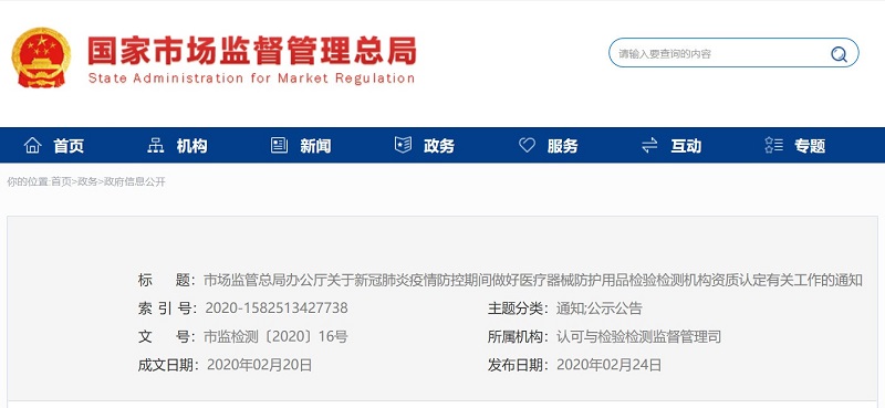 市場監(jiān)管總局辦公廳關(guān)于新冠肺炎疫情防控期間做好醫(yī)療器械防護用品檢驗檢測機構(gòu)資質(zhì)認定有關(guān)工作的通知