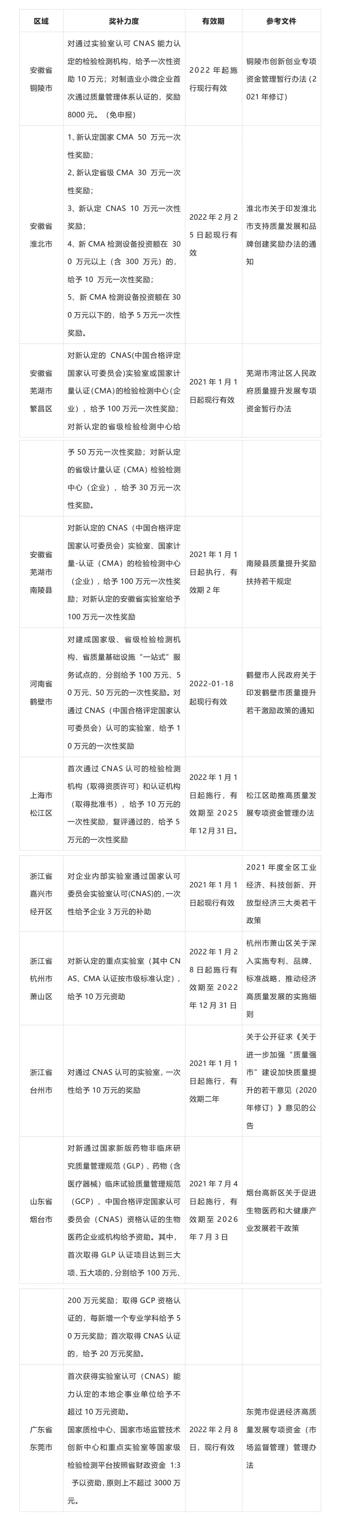 近期,隨著國務(wù)院印發(fā)《“十四五”市場監(jiān)管現(xiàn)代化規(guī)劃》,提高質(zhì)量認證服務(wù)能力與加大認可和檢驗檢測改革創(chuàng)新力度被上升到國家層面,其中重點提及規(guī)劃建設(shè)一批高水平國家質(zhì)檢中心和檢測實驗室?,F(xiàn)對CNAS、CMA認證補貼相關(guān)獎勵政策做了搜集整理,詳情如下: