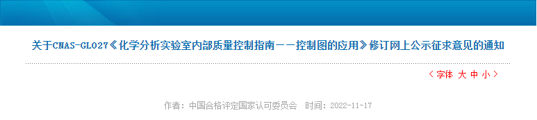 中國(guó)合格評(píng)定國(guó)家認(rèn)可委員會(huì)(CNAS)組織修訂了CNAS-GL027《化學(xué)分析實(shí)驗(yàn)室內(nèi)部質(zhì)量控制指南——控制圖的應(yīng)用》。目前已完成文件征求意見稿,現(xiàn)于網(wǎng)上公示征求意見。