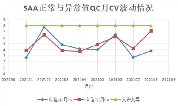 6、觀察室內(nèi)質(zhì)控有無趨勢性變化:在過往質(zhì)控CV變化情況不大,均在實驗室自己設(shè)置的質(zhì)量目標范圍內(nèi)。