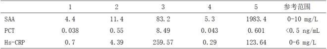 8、查看與其他炎癥指標的吻合情況:隨機選取同月份5名患者同一天SAA與PCT、超敏CRP的聯(lián)動情況,符合患者病情變化。